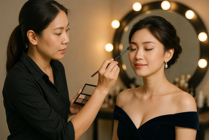 • Trang điểm sang trọng – quý phái: Lớp nền căng mịn, nhấn mắt khói, môi đỏ trầm, dành cho tiệc tối và dạ hội.